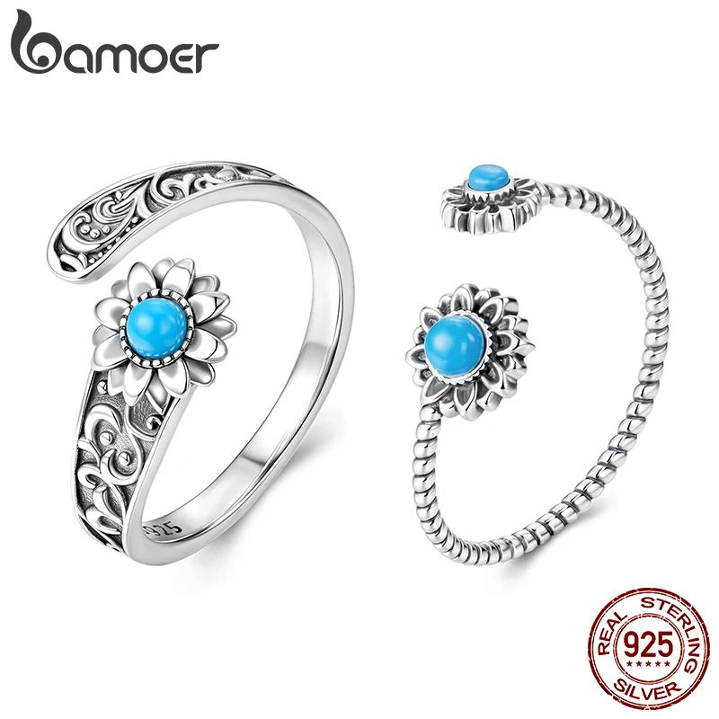 Bamoer 925 Sterling Silver Sunflower Turquoise Open Ring Adjustable Retro Oxidized Ring for Mother Birthday Gift Fine Jewelry  Read more