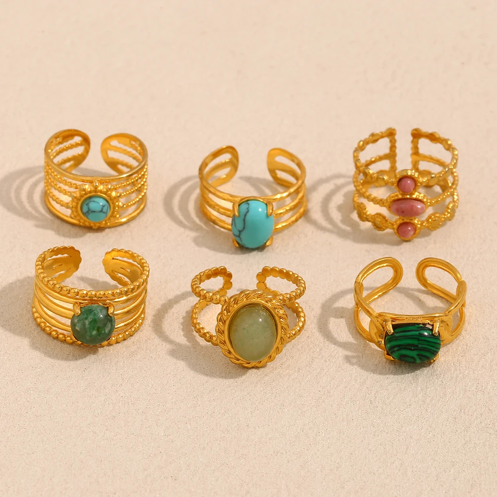 Bohemian Turquoise Zircon Natural Stone Opening Rings for Women Gold Plated Stainless Steel Finger Rings Jewelry Gifts Wholesale