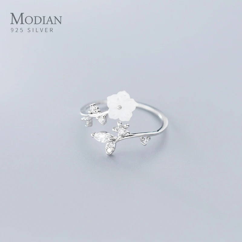 Modian New 925 Sterling Silver Radiant Zircon Leaves White Shell Flower Free Size Ring for Women Plant Ring Original Jewelry