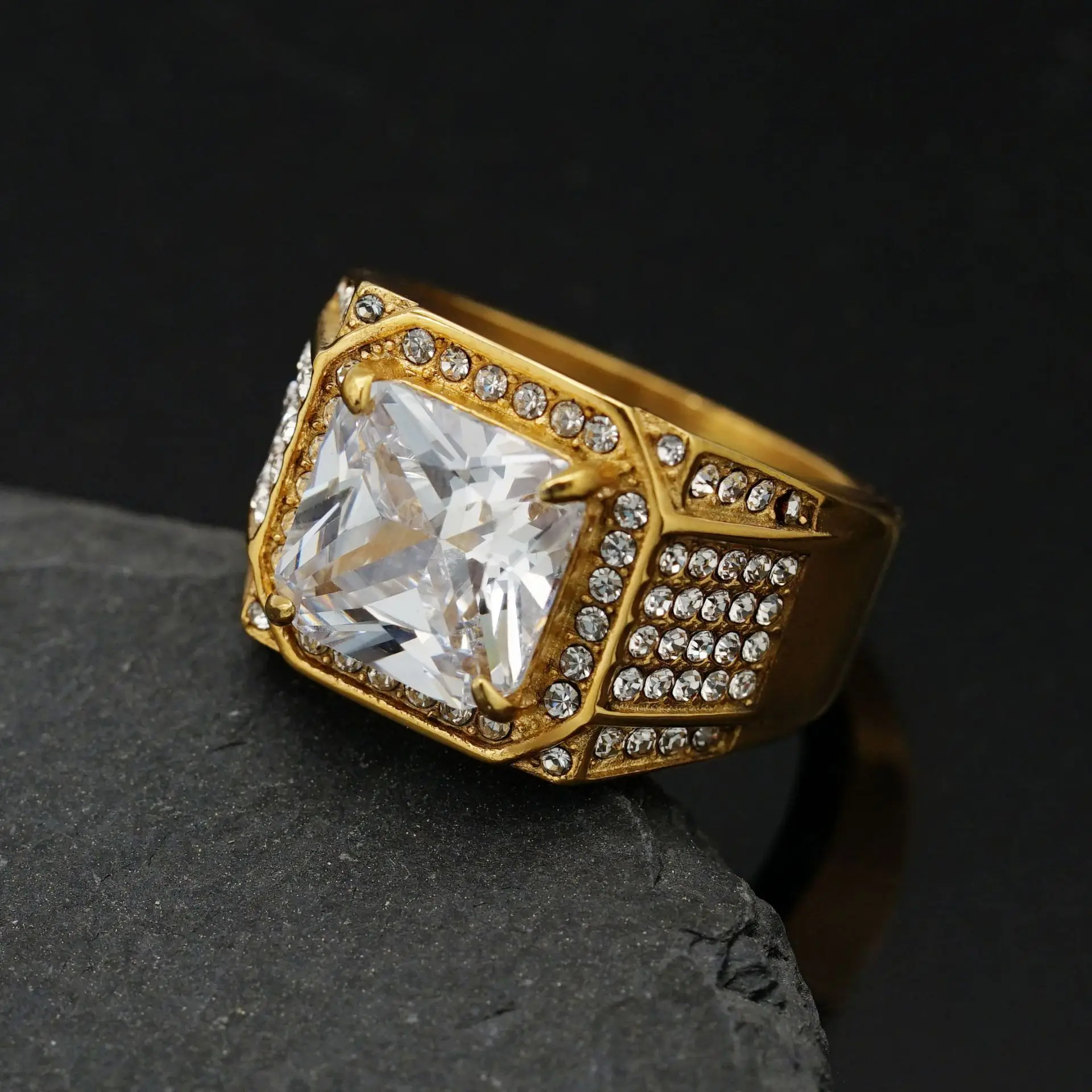 Hip Hop Men's gold color Bling Square Ring AAA zircon 316L Stainless Steel with rhinestone Large Men's Ring Cool Jewelry Gift