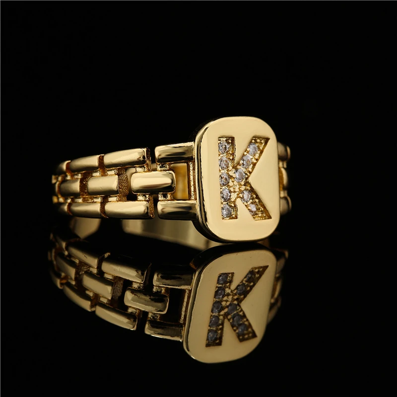 2024 New Fashion Hip hop Adjustable Gold Color CZ A-Z Letter Ring Statement Square Gold Name Rings For Women Girl Gift