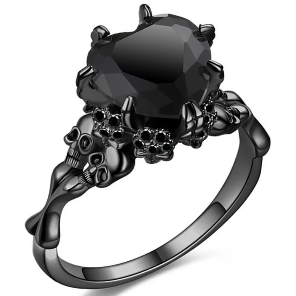 Skull Gothic Black Ring Heart-shape Red Crystal Vampire Double Skull Rings Black for Women Party Wedding Jewelry