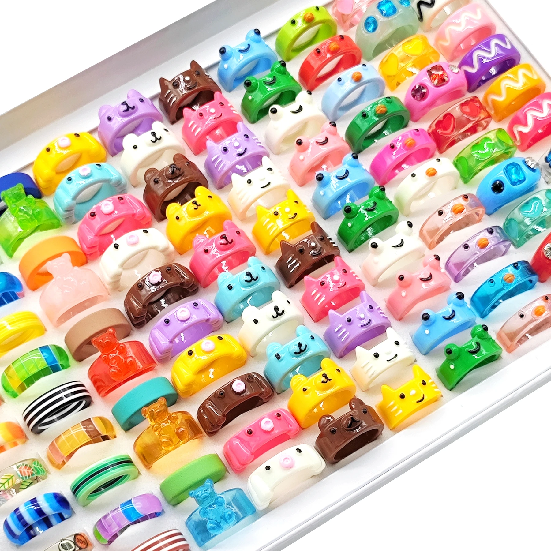 12pcs/Lot Mixed Color Cute Animal Flower Heart Resin Crystal Rings Women Girl Fashion Sweet Frog Cat Charms Finger Party Jewelry