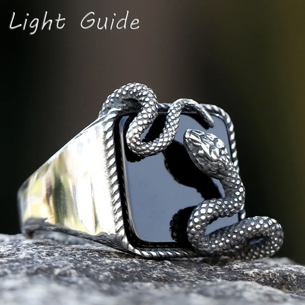 2023 New Good Detail Men's Punk Rock Black Stone Ring With 3D Snake Gothic Style 316L Stainless Steel Biker Anel Movie jewellery