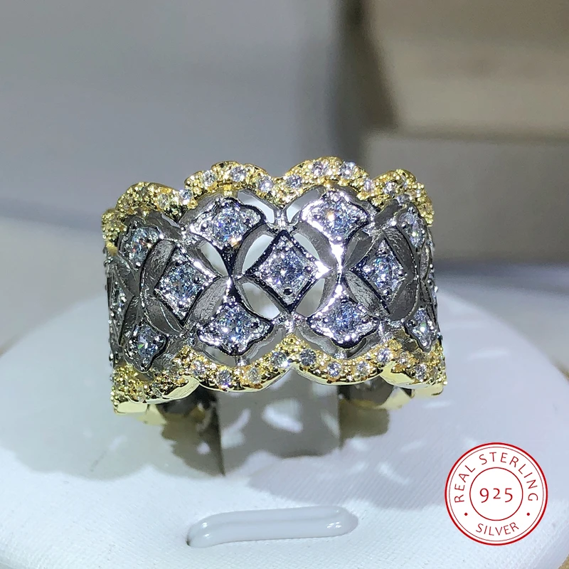 925 Sterling Silver Cent Gold Zircon Big Ring For Ladies Men Crown Ring Couple Jewelry Party Birthday Gift