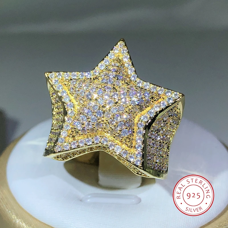 925 Silver Classic Yellow Gold Five Star Zircon Ring For Women & Men Big Ring Party Birthday Jewelry Gift