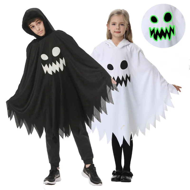 Halloween Kids Cosplay Costume White Black Luminous Ghost Luminous Face Cape Shawl Party Dress-Up Costume Boys Cape Girl Skirt