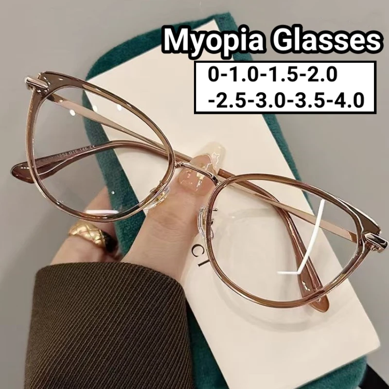 New Cat Ear Myopia Glasses Woman -1.0-1.5-2.0-2.5-3.0-3.5-4.0To-6.0 Prescription Eyeglasses Alloy Frame Eyewear lentes ópticos