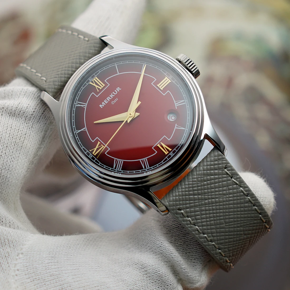 Merkur Watch Wine Red Dial Watch Metal Vintage Casual Dress Watches Handwind Mechanical Watch for Men Relogio Masculino 38mm