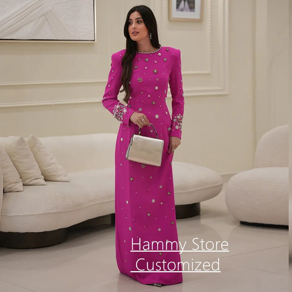 Fuchsia Evening Dress Customized Luxury Round Neck Full Sleeves Pearls Crystal Saudi Arabian Prom Gown Arab Party Dresses
