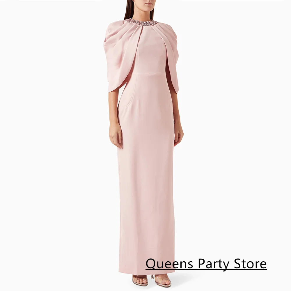 Pink Evening Dress Customized Crystal Round Neck with Cape Straight Back Slit Saudi Arabic Prom Gown Dancing Party Dresses