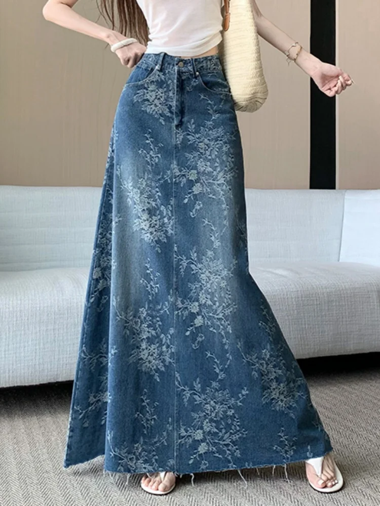 SMTHMA Floral Embroidered Cowboy Skirt For Women Summer High Waist A-line Long Skirt Ladies Big Swing Skirt Trend Fashion