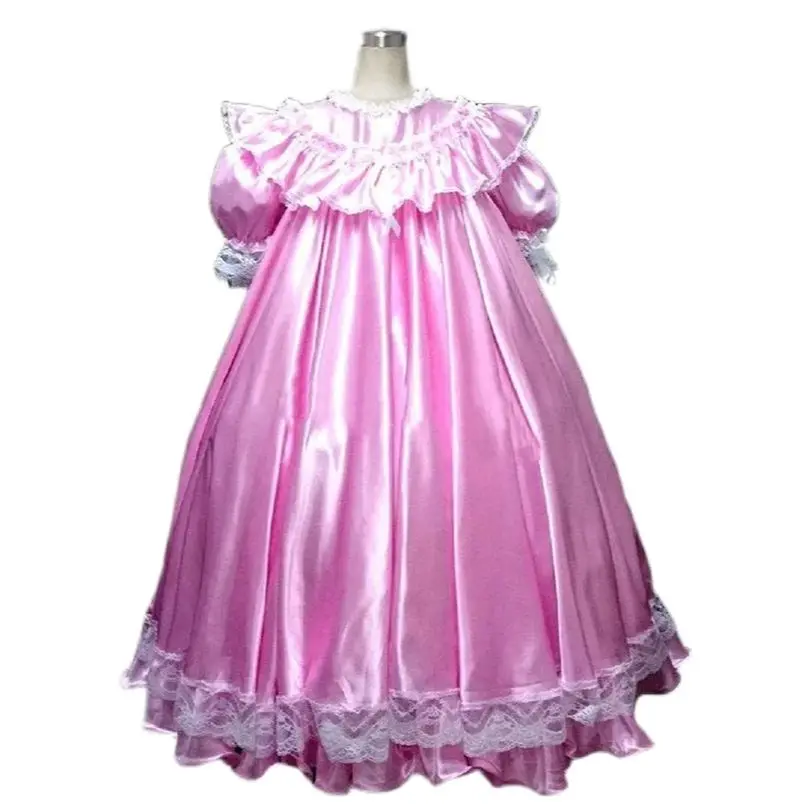 Pink Smooth Satin Shoulder Fluffy Bubble Sleeves with Lace Embellished Cuffs Lace Hemline Long Skirt