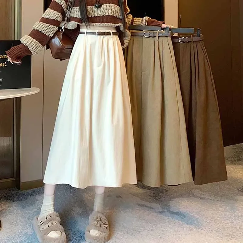 Vintage Corduroy Skirts Female Korean Fashion High Waist Long Skirt Woman 2024 Fall Elegant Streetwear A Line Pleated Skirt