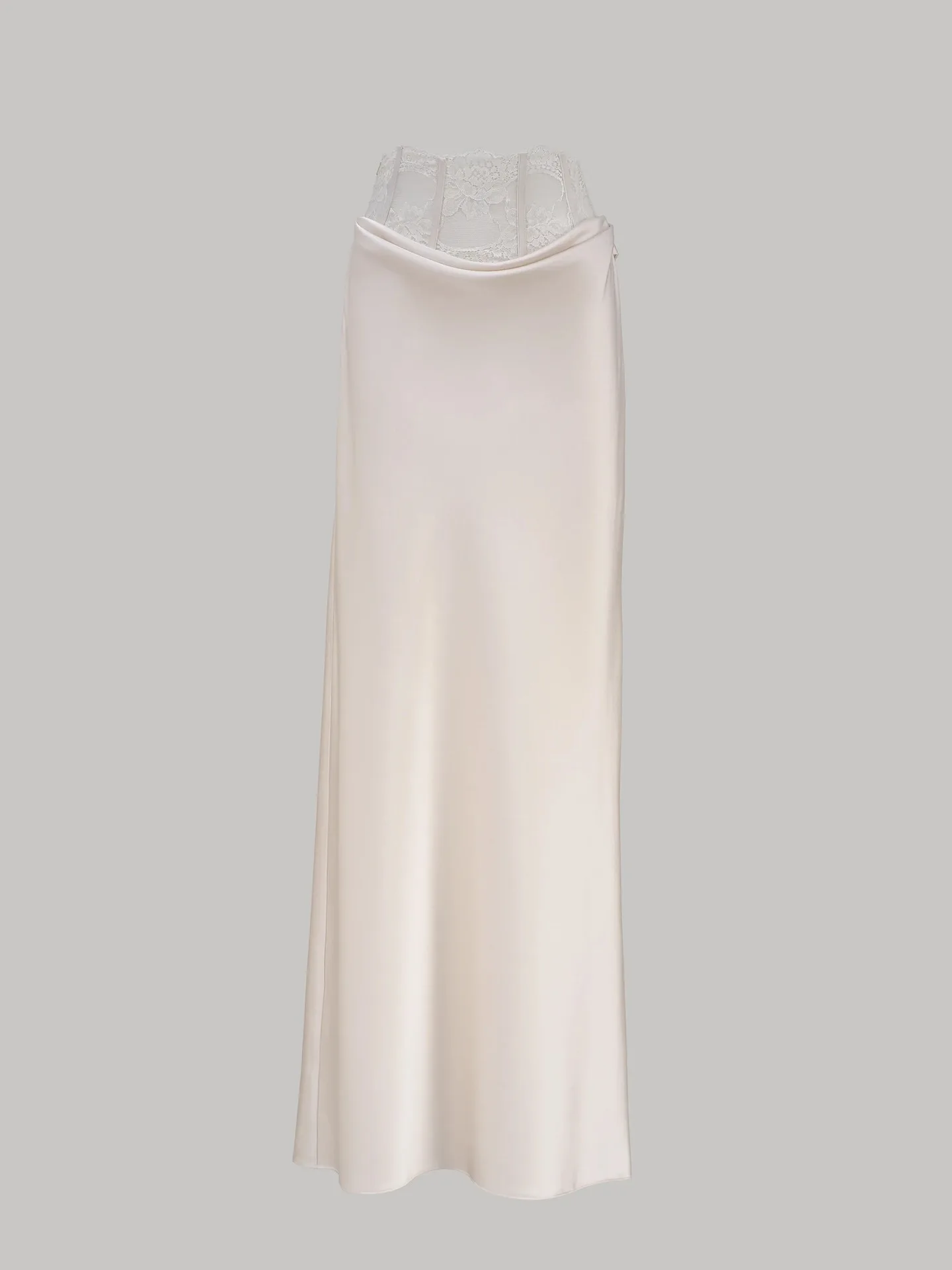 Lace Patchwork Satin Long Skirt for Women Elegant A-Line High Waist Mermaid Skirt Female Silk Office Ladies Faldas 2025 Fashion