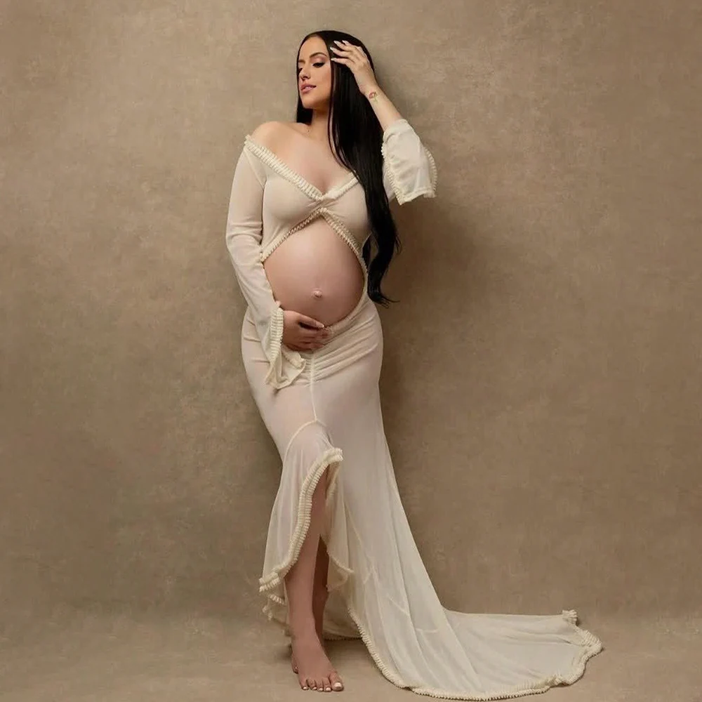 Maternity Sheer Lace Ruffle Ruched Dress Long Sleeve Sexy Slit Belly Gowns Pregnant Dress For Photoshoot Simple Baby Shower