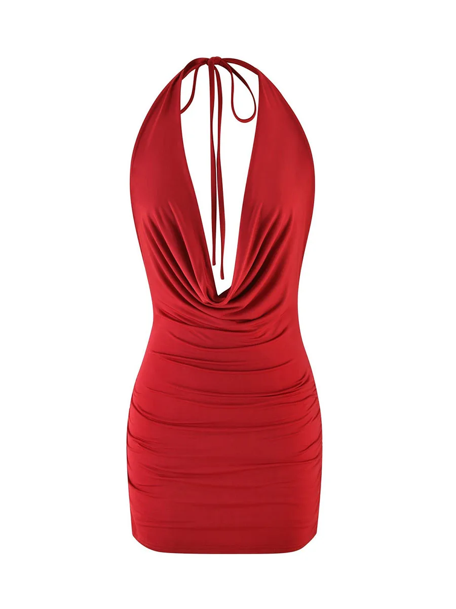 Women s Sexy Halter Neck Sleeveless Mini Dress with Open Back and Ruched Detailing - Solid Color Summer Dress