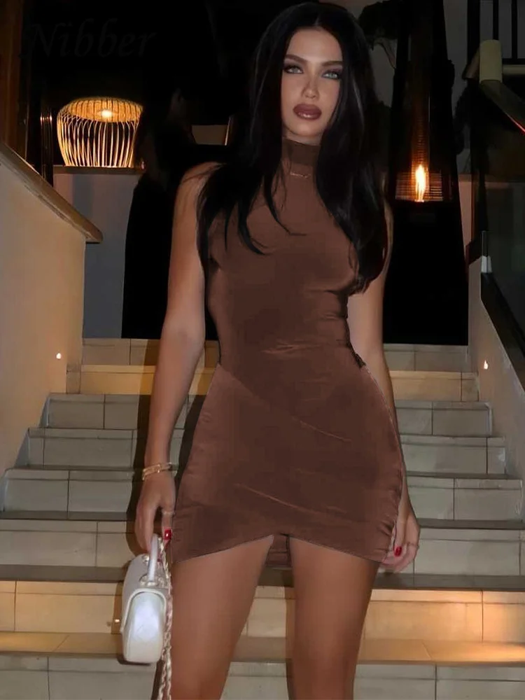 Nibber Cross Concise Mini Women Dress Summer Fashion Sleeveless Stand Collar Ruched Chic Bodycon Female Basic Party Streetwear