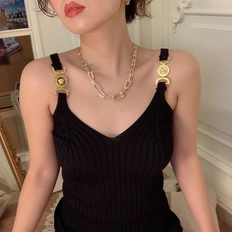 Combhasaki Women's Y2K Tank Tops Rib Knit V-Neck Metal Chain Sling Design Slim Fit Breathable Versatile Streetwear Sweater Vest
