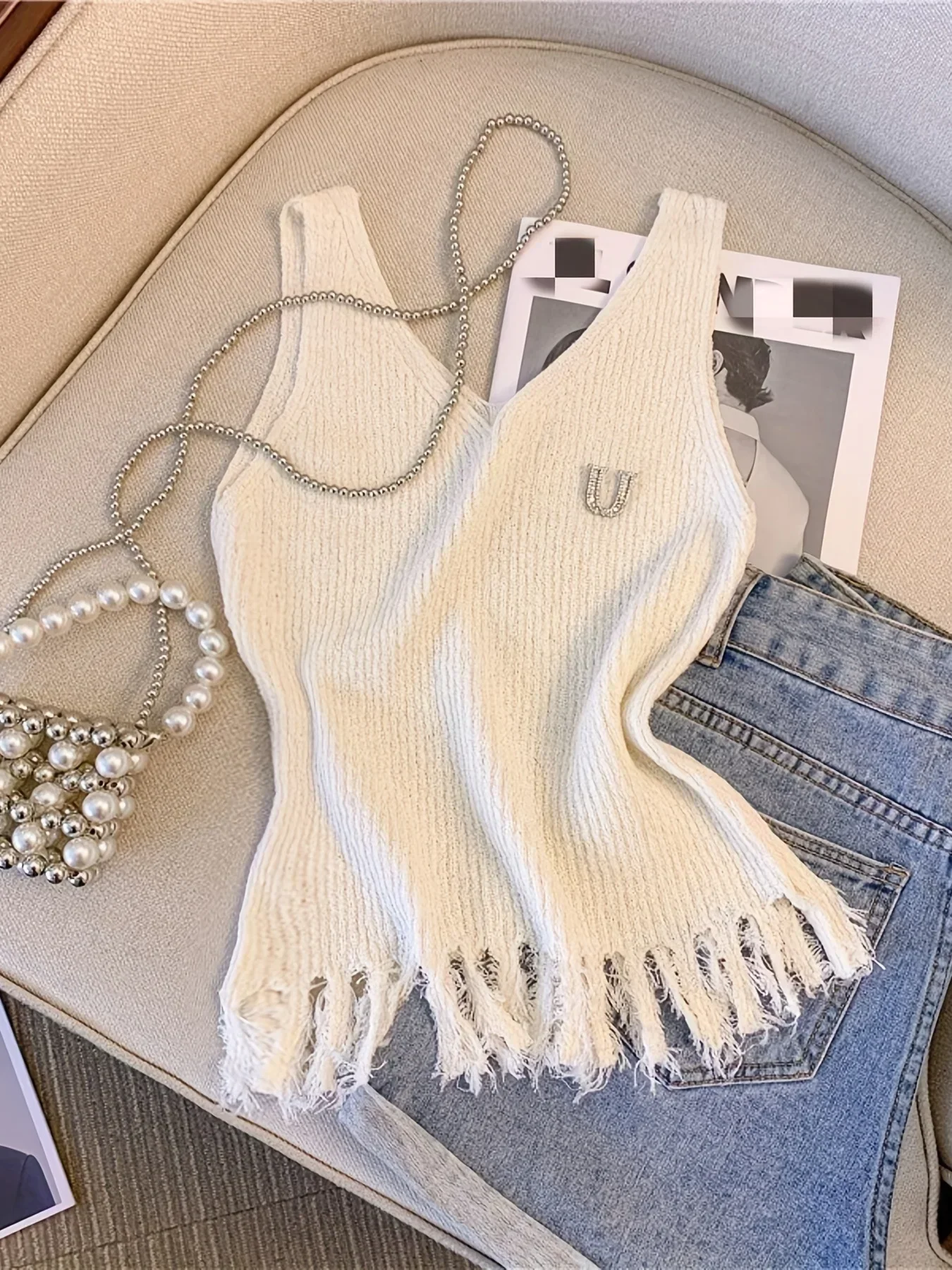 2024 Solid Tassel Hem Tank Top Knit Elastic Casual V Neck Summer Sleeveless Top Women's Clothing Crop Top