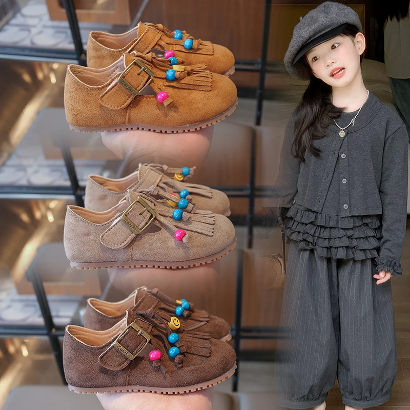 Girls' Shoes Tasseled Small Leather Shoes Yellow Style Retro Versatile Kids Casual Shoes 1-18 Years Old Children's Single Shoes