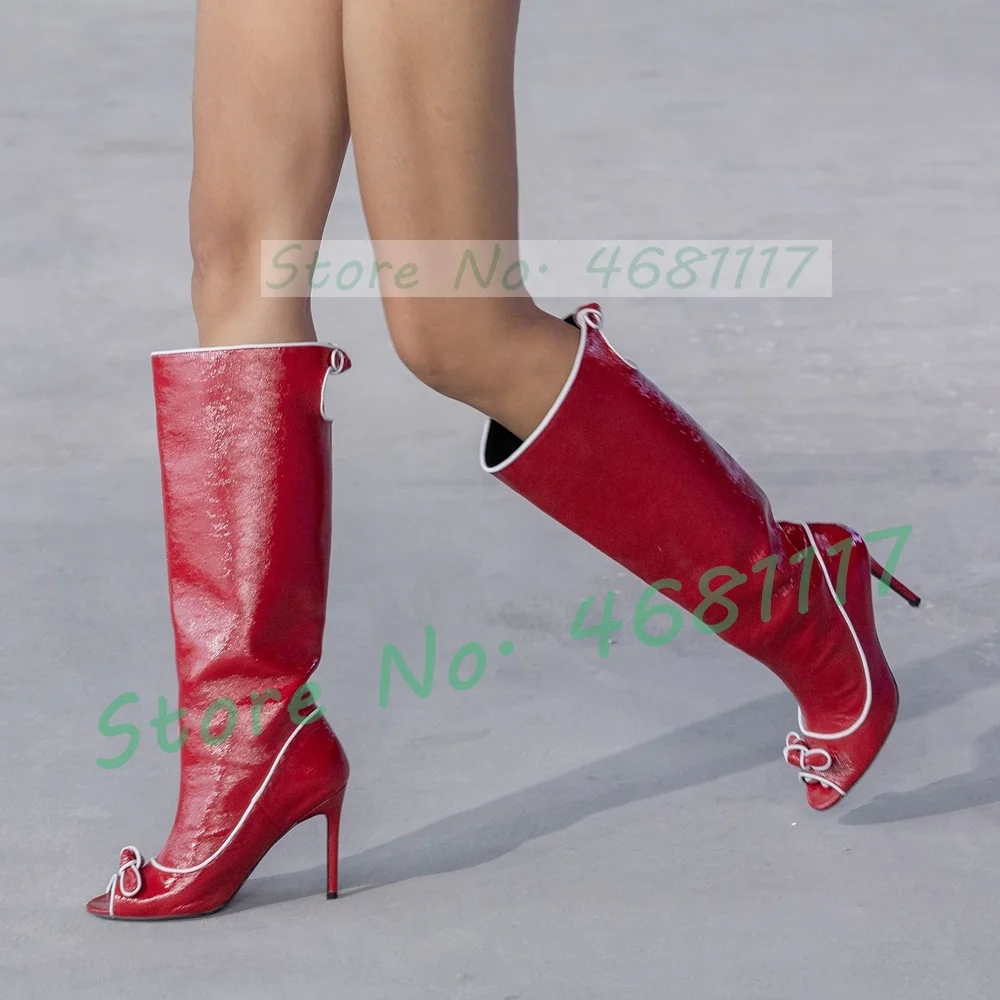 Bowknot Peep Toe Knee Length Boots Women Fashion Elegant Back Hollow Out Tall Boot Street Style Yellow Slip On Cool Sewing Shoes
