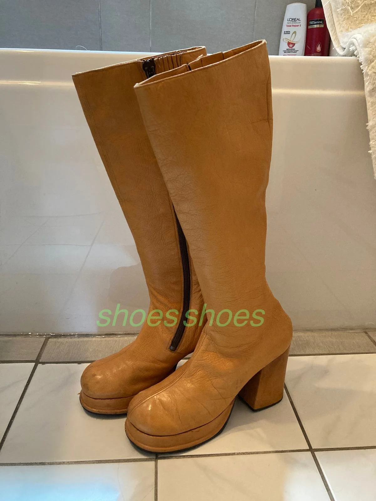 Lady Runway Y2K Style Platform Knee Boots New Arrive Zipper Pu Fall Dark Brown Yellow Chunky Heel Runway Footwear Size 34-46