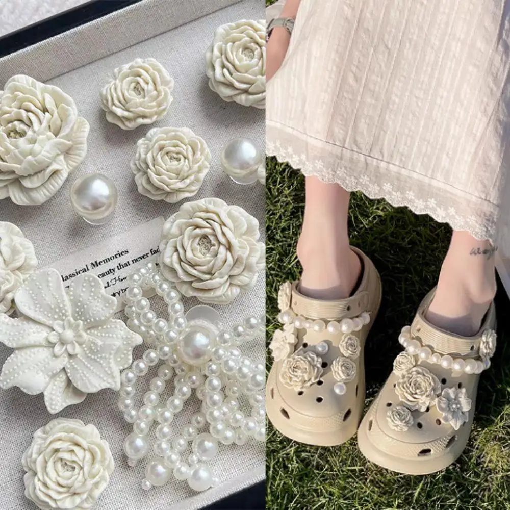 3D Hole Shoe Clips Clogs Slipper Shoe Buckle Flower Shoes Charm Bone White Shoe Lace Clips Detachable Pearls Shoe Decoration Set
