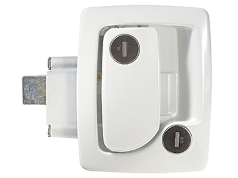 RV Designer Collection T502 Travel Trailer Lock-White - Built-In deadbolt eliminates the need for an add-on residential type deadbolt. Deadbolt locks into the fully extended position for true deadbolt functionality. replaces TriMark 60-251. Requires an opening of 3.446" x 4.312". Fits 1-1/4" - 1-1/2" door...