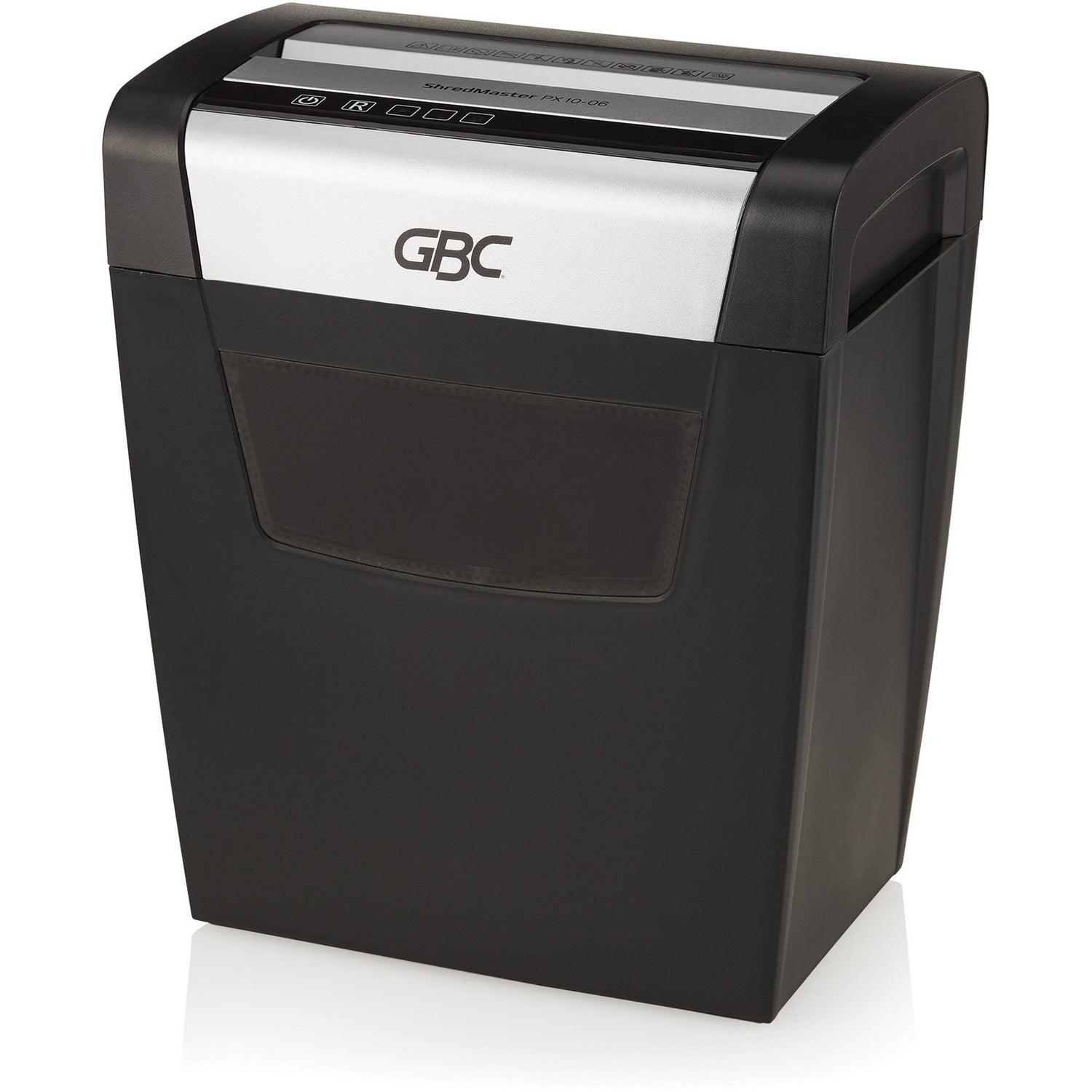Easily shred security reports, financial statements, and other confidential documents with the GBC 1757405 ShredMaster 10 sheet front-facing super cross-cut shredder. This machine shreds paper into small 3/16" x 1 1/2" pieces for a high-level of...