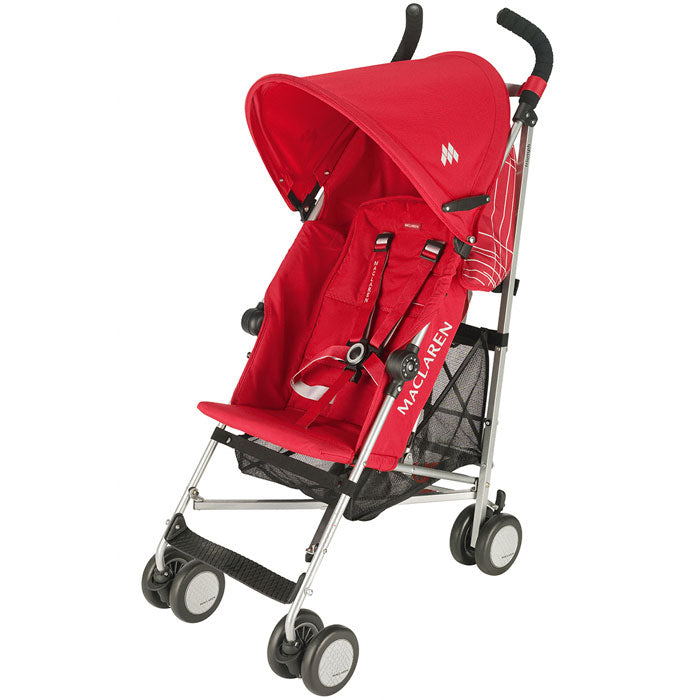 Maclaren Triumph Stroller - Scarlet - Now with hinge cover safety built in! Rain Cover Included! Foot-operated linked parking brakesUpdated harness buckle and hubcapsBreathable mesh seatHeight adjustable shoulder harnessMultiple seating positionsCarry strap on backStandard Features on all...