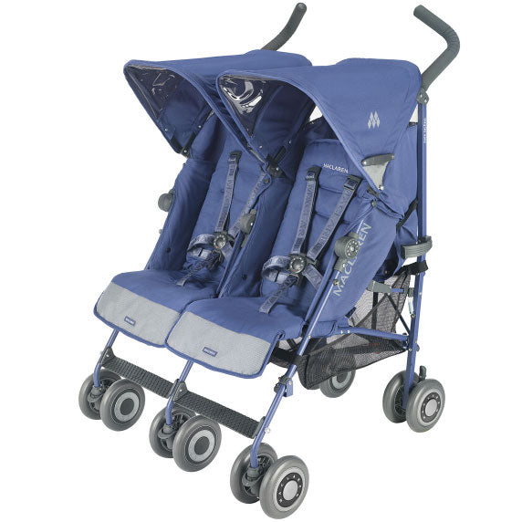 Maclaren Twin Techno - Crown Blue on Crown Blue Frame - Now with hinge cover safety built in! Rain Cover Included! Built for comfort and performance stroller for two. 5 point harness for added security. Removable washable seat. Compact umbrella fold. Water resistant hood. High-performance aluminum frame....