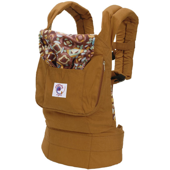 ERGObaby Carrier - Organic Desert Bloom - This 100% Organic cotton ERGObaby carrier features luxurious shades of the Sahara. Blue, brown, and gold bloom in geometric flowers on the lining, with an exterior of golden desert sand.