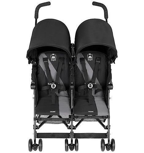 Maclaren Twin Triumph Stroller - Black/Charcoal - This all purpose go fast buggy for two has a high-performance aluminum frame and features a one-hand compact umbrella fold, a height adjustable 5-point harness for added security and has multiple reclining positions with adjusting straps.
