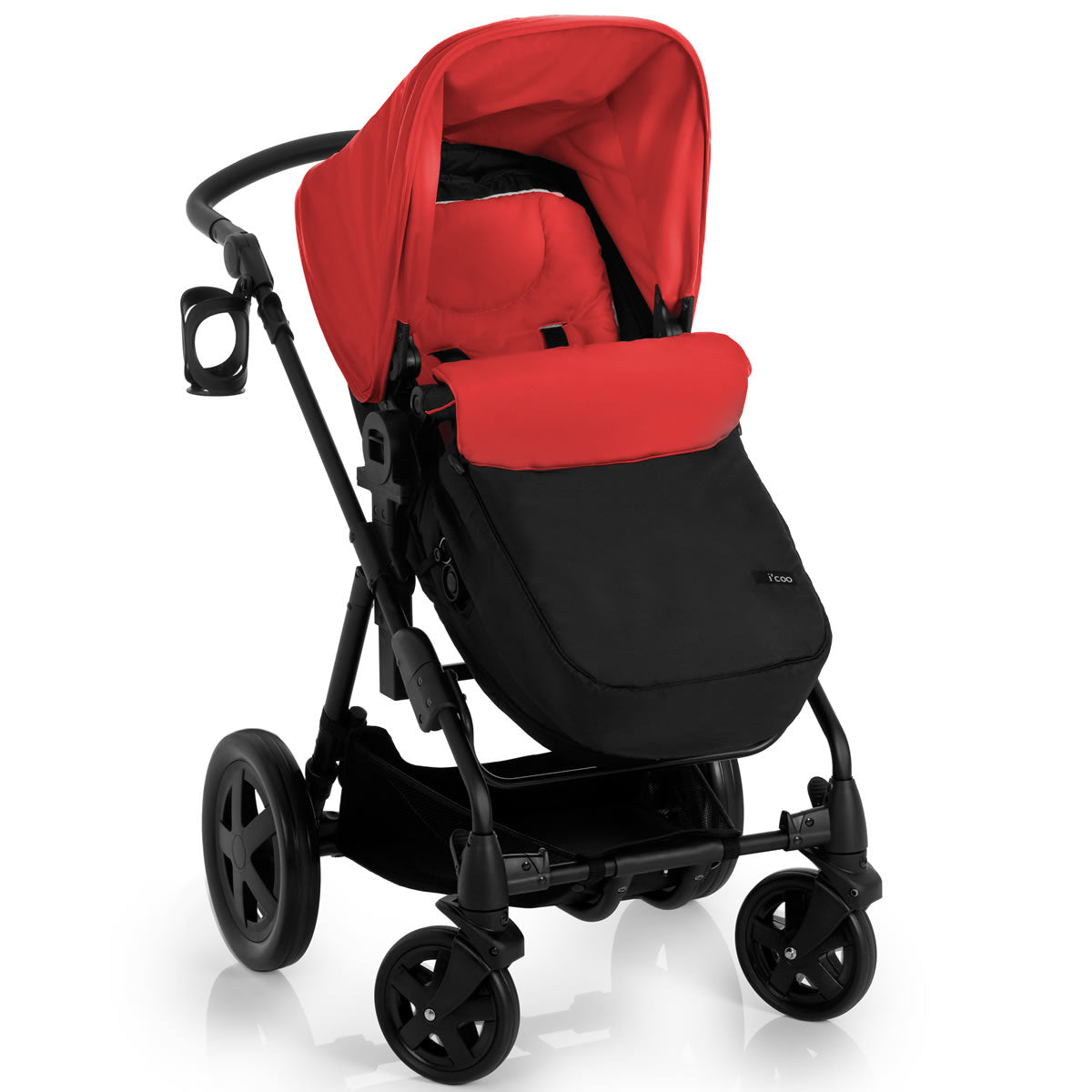 I'Coo Photon Stroller - Red - The Photon is built on a German-engineered, ultra light aluminum frame and is loaded with an impressive list of features. The i'coo Photon's seat to bassinet conversion feature lets a baby lay completely flat one minute or sit up straight the next. Or...