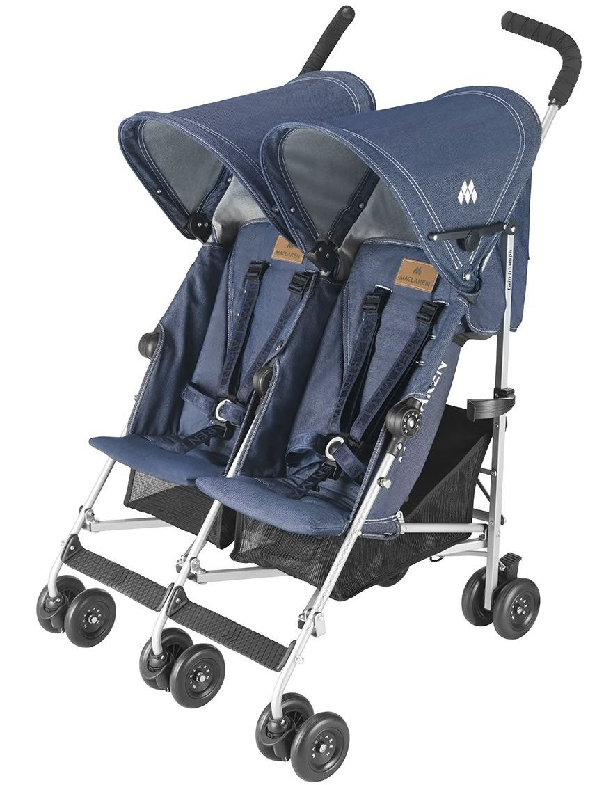 Maclaren 2013 Twin Triumph - Denim - Maclaren's lightest twin buggy, featuring separate seat mechanisms so one child can recline while the other looks out at the world. The buggy fits through standard doorways.