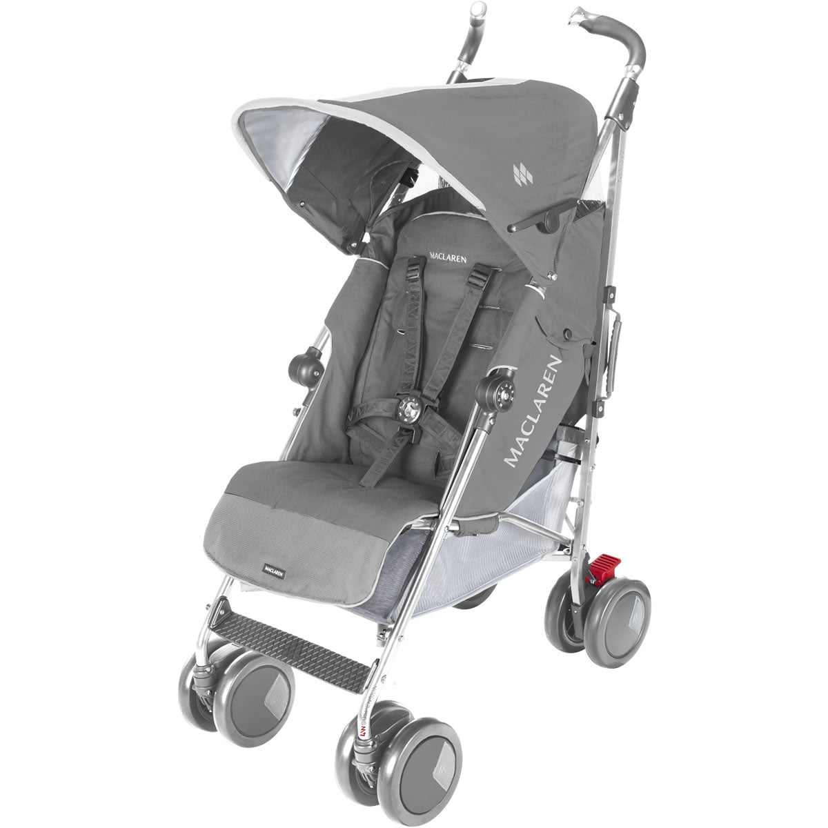Maclaren Techno XT Stroller - Charcoal screenshot. Strollers / Joggers directory of Baby Gear. Click to enlarge product image  Maclaren Techno XT Stroller - Charcoal - shopping basket. Extra large, UPF 50+ waterproof square hood with zip-open panel. Three-position adjustable molded handles. Six alloy-style wheels with self-aligning front swivel unit. Front/rear four-wheel suspension. Five-point safety harness. Foot-oper