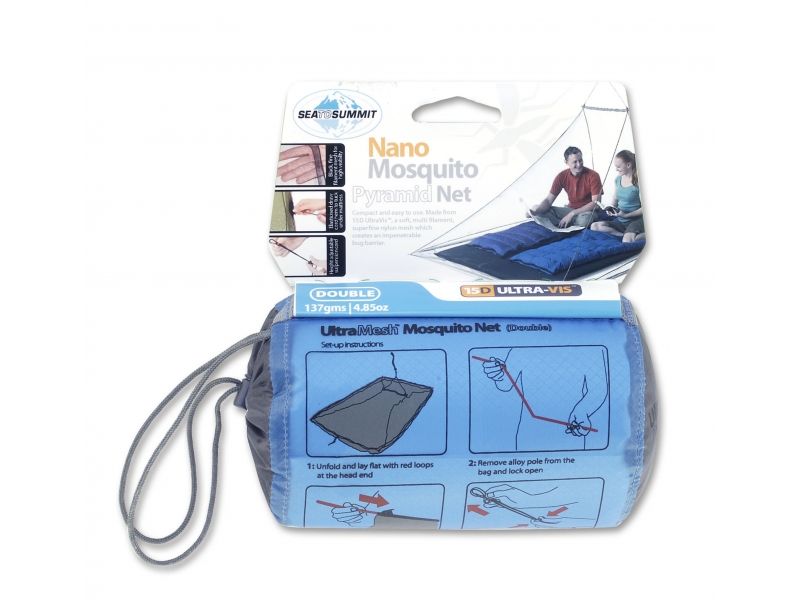Sea to Summit Nano Pyramid Mosquito Net Shelter Double screenshot. Camping & Hiking Gear directory of Sports Equipment & Outdoor Gear. Click to enlarge product image  Sea to Summit Nano Pyramid Mosquito Net Shelter Double - Sea To Summit's Nano Pyramid Net Shelter Double is now 60% lighter and half the compact size! The elasticized hanging cord and drawcord hem keeps the mesh under your mattress. 15D ultraVis mesh makes for a very light mesh with great visibility and air flo