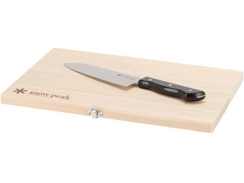 Snow Peak Chopping Board Knife Set One Color, L screenshot. Camping & Hiking Gear directory of Sports Equipment & Outdoor Gear. Click to enlarge product image  Snow Peak Chopping Board Knife Set One Color, L - The Chopping Board Knife Set from Snow Peak ensures you always have a stable, durable surface for slicing up stew veggies or the day's catch. The chopping board folds in half and locks into place to safely store an included stainless-steel knife, and feat