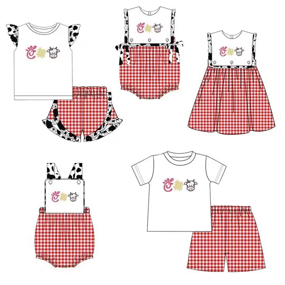 new design Baby costume boys outfit set girls dress kids boutique clothes white T-shirt red plaid shorts two-piece set onesies