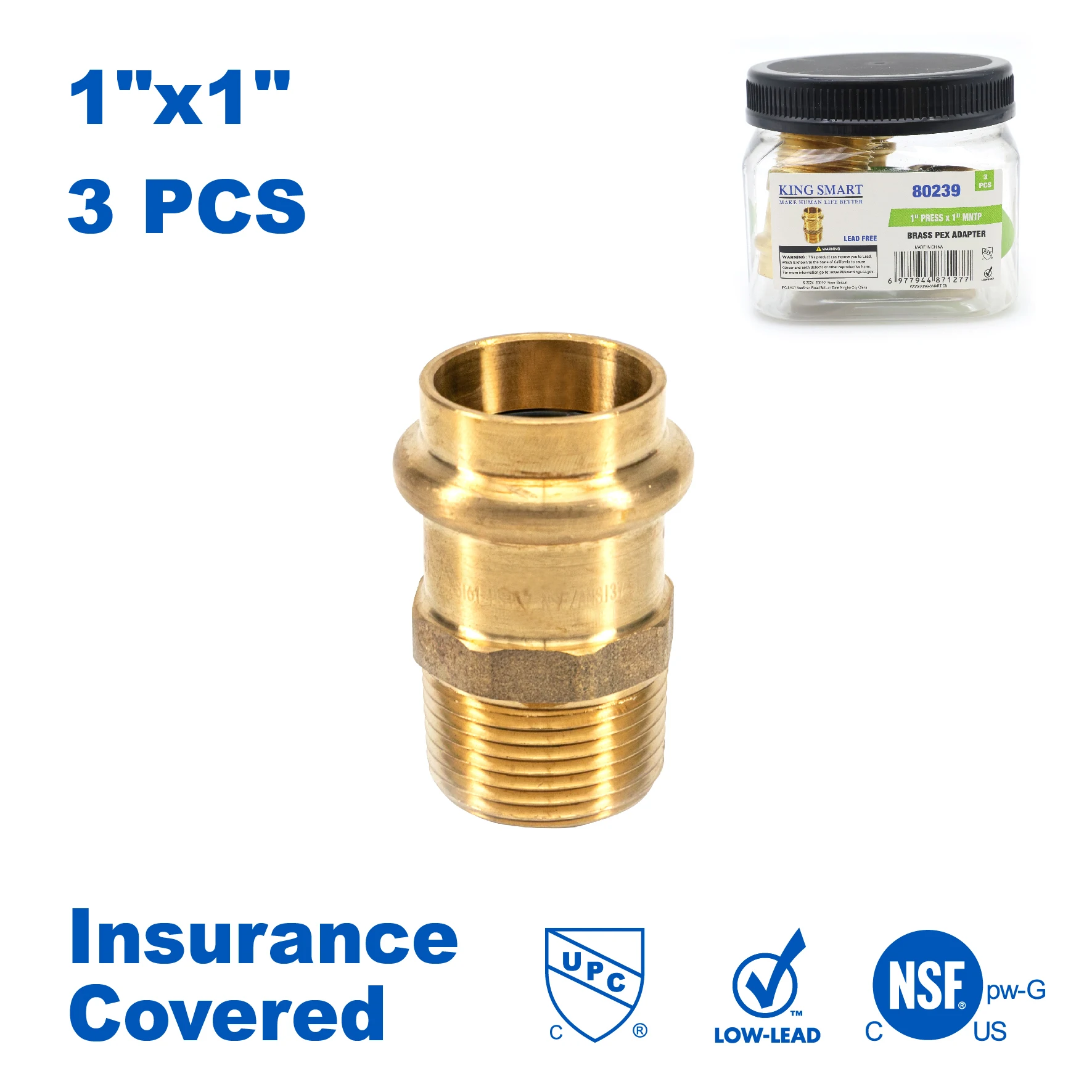 KING SMART 1" Press * 1" Male NPT Straight Adapter; 3 Pcs/Case; Lead Free Brass; 80239