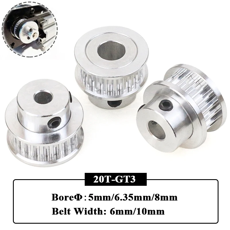 3Pcs GT3 20 Teeth Timing Aluminum Pulley Bore 5mm/6.35mm/8mm Belt Width 6mm/10mm 3GT Timing Belt Pulley for 3D Printer