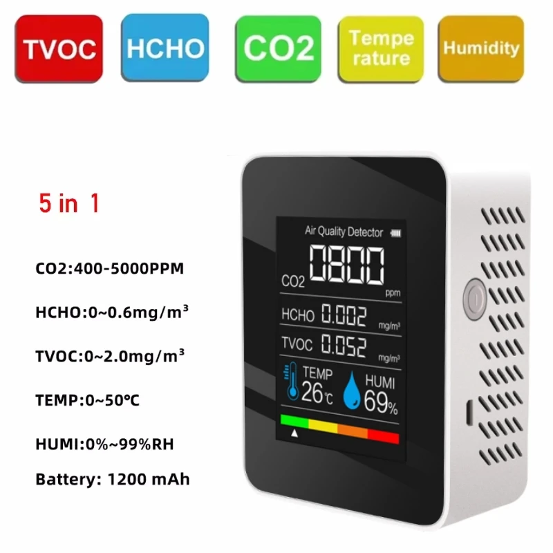 5in1 Multifunctional CO2 Meter Digital Temperature Humidity Tester Carbon Dioxide TVOC HCHO Detector Air Quality Monitor