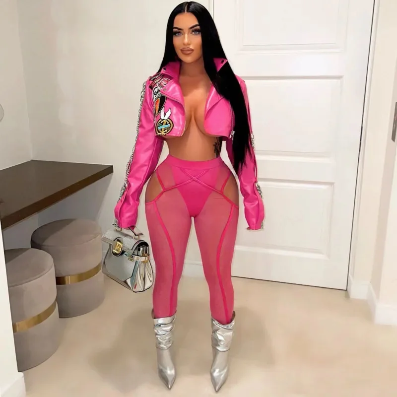 Fashion Rose Pink Leather PU Jackets Women Punk Moto Coat Lapel Chain Patchwork Cropped Jackets Hot Girl Autumn Y2K Streetwear