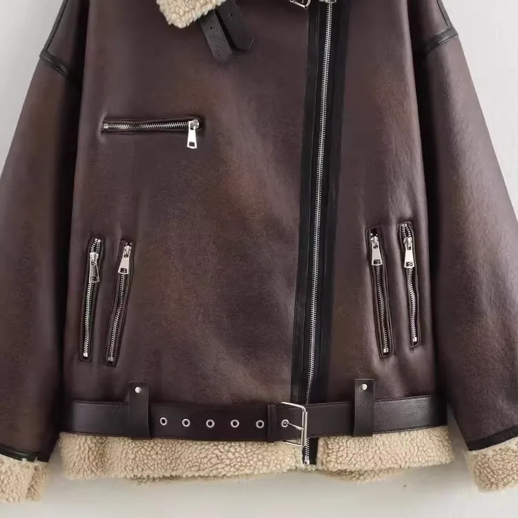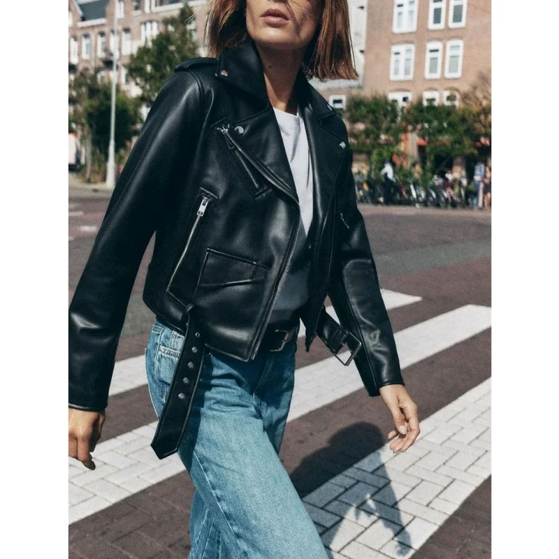 2025 new luxury and fashionable women's clothing belt slim fit leather jacket with multiple pockets motorcycle jacket jacket