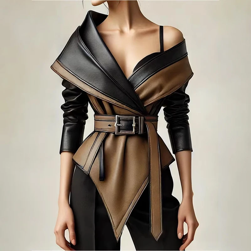 PU Faux Leather Jacket for Women's One Shoulder Splice Irregular Hem Long Sleeve Leather Coat Casual Vintage Y2K Outerwear