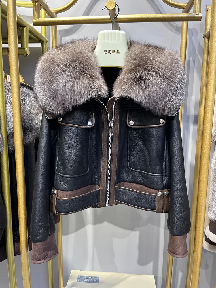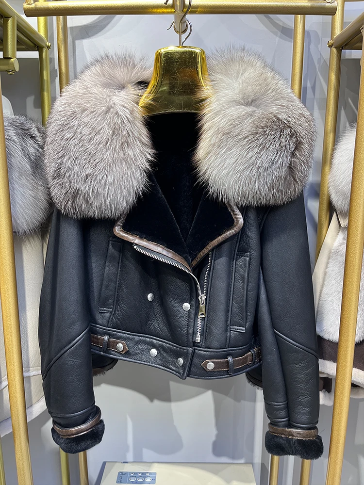 2024 Winter Warm Women Real Fox Fur Collar Natural Merino Sheep Fur Coat Genuine Leather Jacket Thick Luxury Female Coats