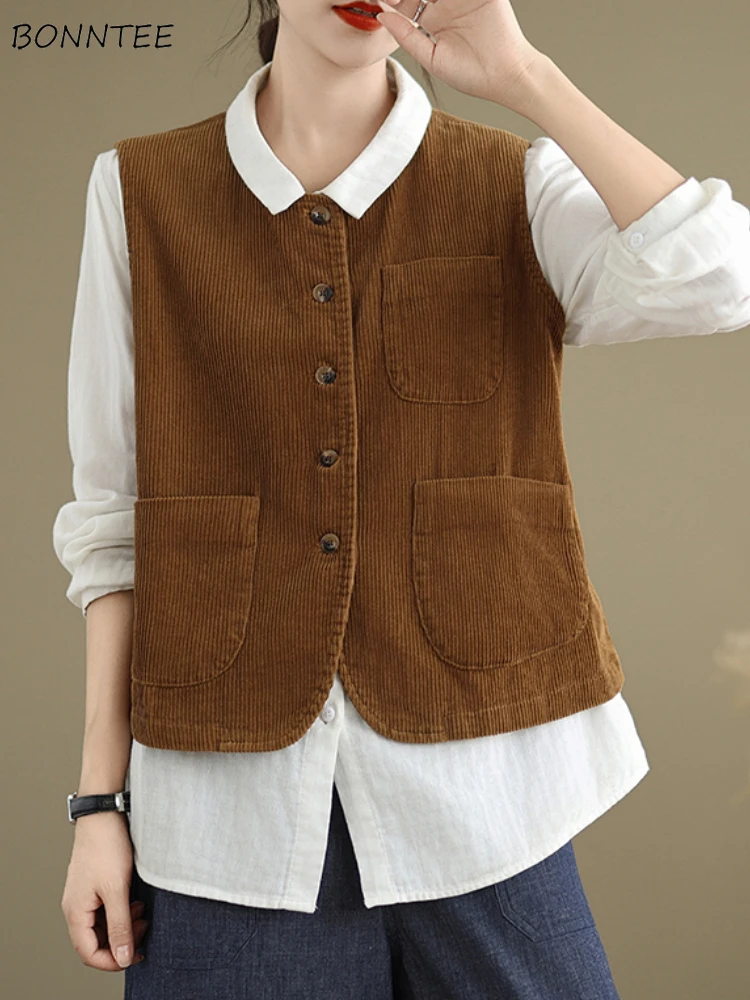 Vintage Corduroy Vests Women Solid Preppy Sweet Fashion Coat Simple Cleanfit Loose Casual Outwear Japanese Harajuku Aesthetic