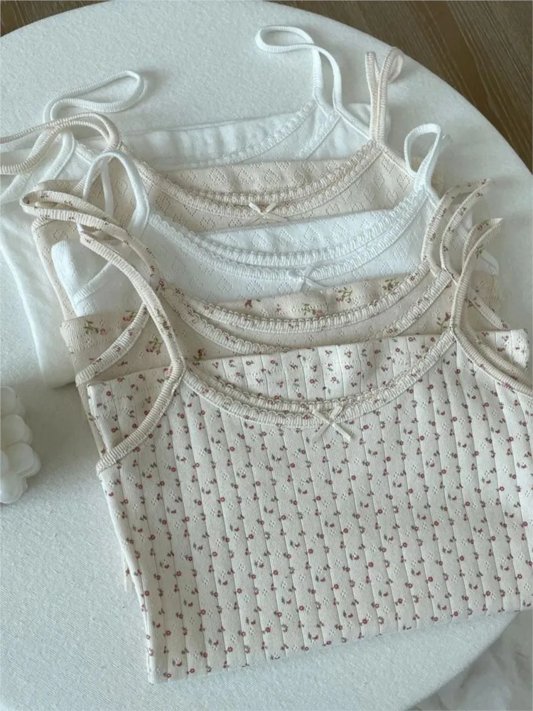 Vintage Floral Print Eyelet Bow Cropped Vests Women Streetwear Casual Slim Lace Trim Camis Sweet Preppy Style Cute Tank Tops Y2K