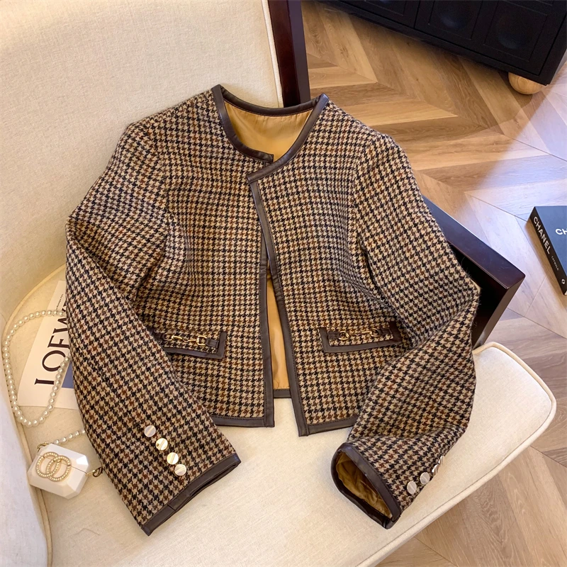 Fall Faion Plaid Color Blo PU Leather Jaet Women's Outerwear irt Sli ains Fraance Sle Quilted Coat  Read more